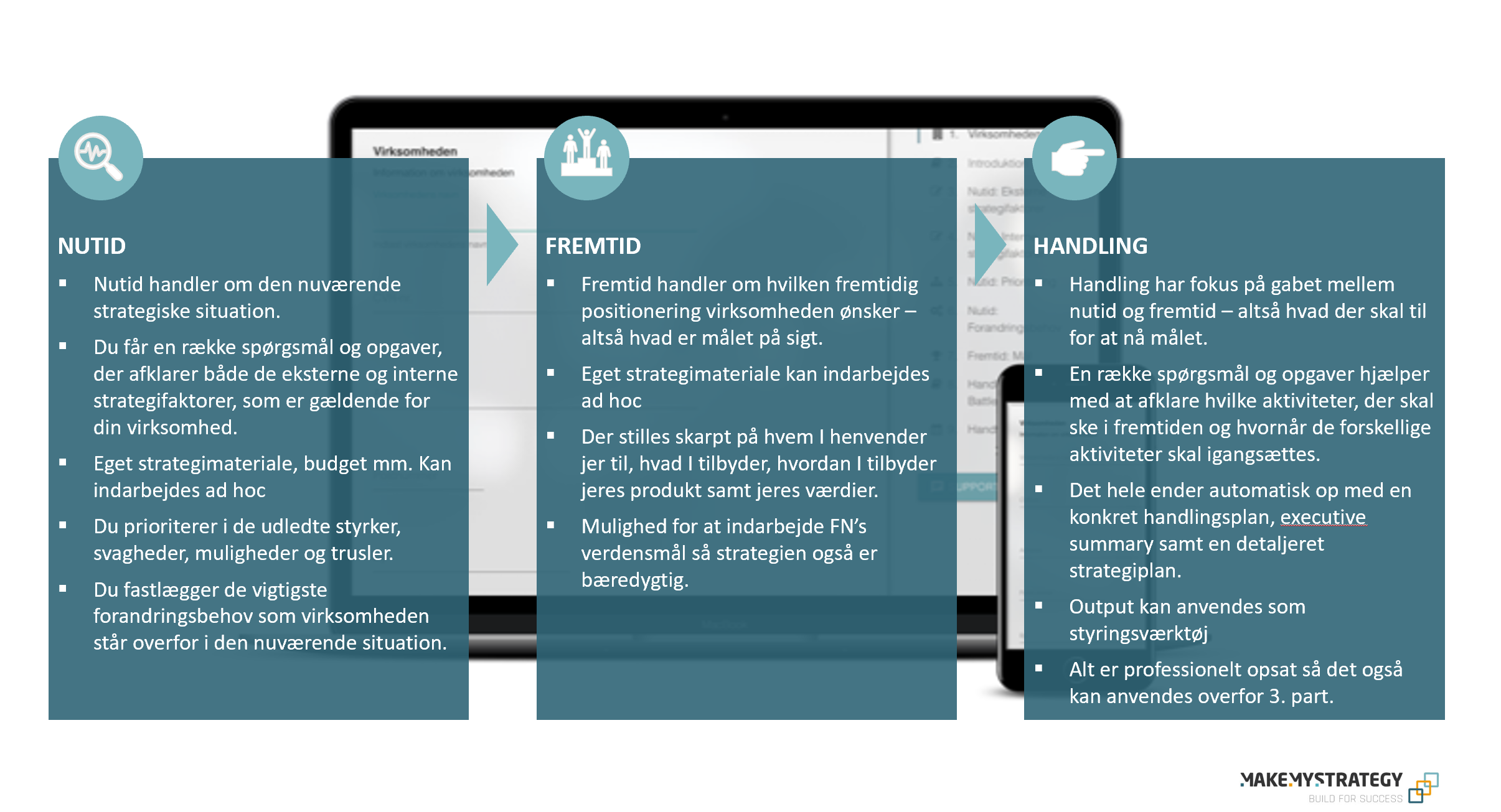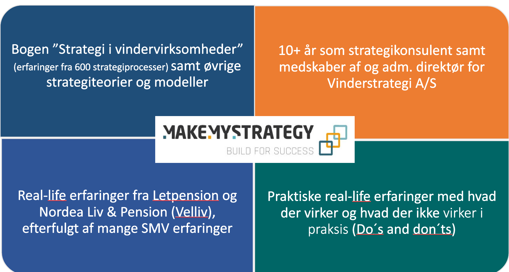 MakeMyStrategy™ er et digitalt værktøj der bygger på sit fundament på 4 grundpiller:
